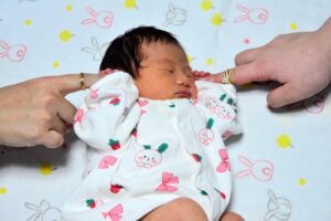 娘がうまれて、1週間後、夫の指と私の指を必死にぎゅっとしている写真になります。