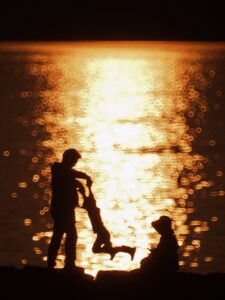 海辺でくつろぐ親子をレフレックスレンズで撮影しました。