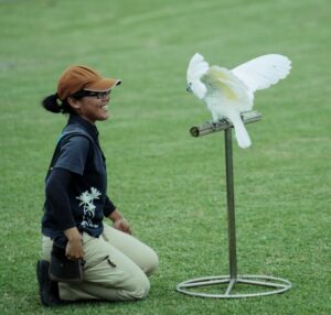 そこには、笑顔で鳥と向き合う飼育員と、羽を広げる美しいオウムの姿があった。