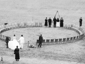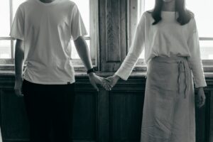 遠距離を乗り越えた二人が並び、静かな空間で手を取り合う。