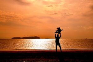 香川県三豊市父母が浜の夕陽を背景に父と娘のふれあいの光景です。