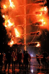 横木にアシやススキの束を結び付けた重さ1トン、高さ20mの木の葉形の巨大松明に火が点けられます。