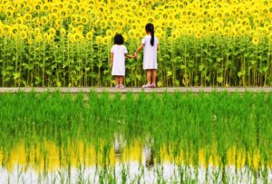 田植えが終わった田んぼに映る手を繋いだ姿に姉妹の絆が感じられました。