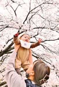 満開の桜の下で赤ちゃんをあやす母親です。